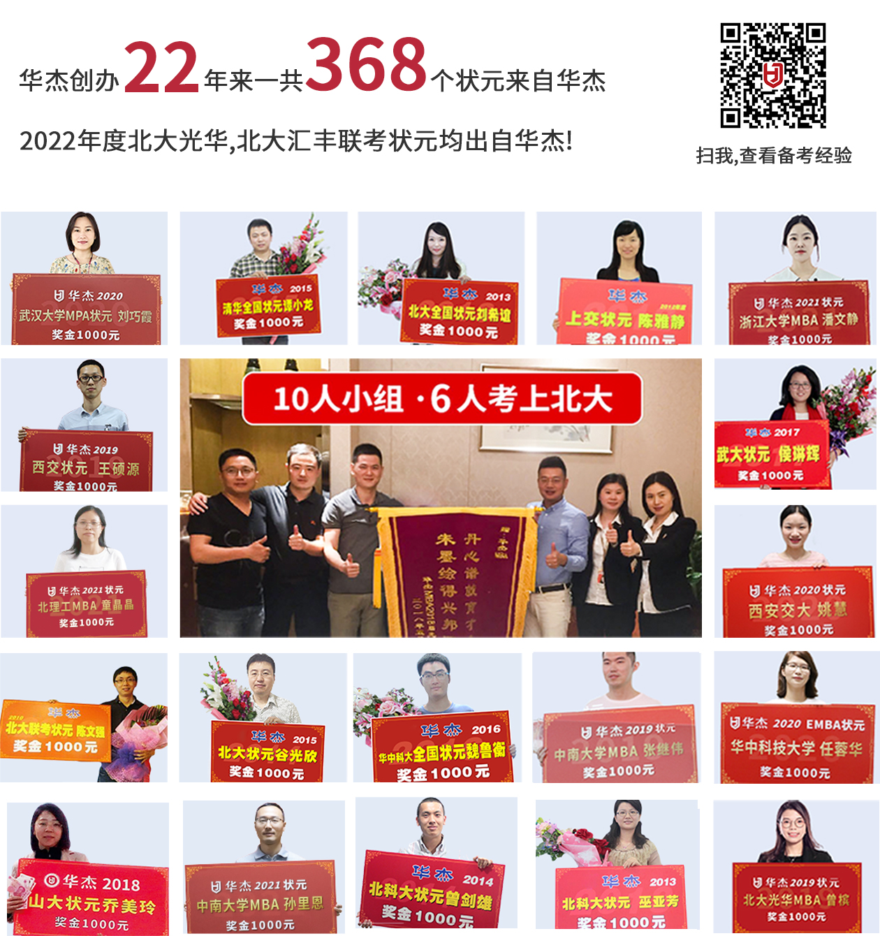 华杰多年命中联考真题,但比命中真题更重要的是华杰对历年命题方向的把握与洞悉,让学员少走弯路;比华杰368位联考状元更重要的是华杰学员比同类机构学生平均高10-20分。