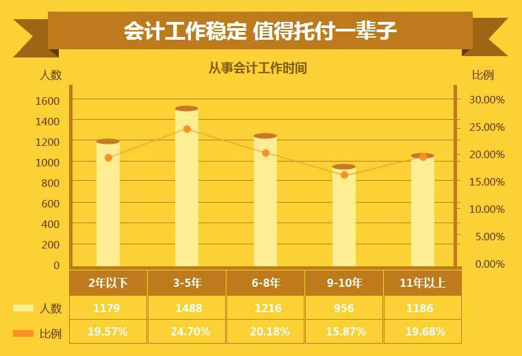 总体上看:大部分会计从业者工作年限偏高,工作3年以上的人数占比高达80%,会计工作很稳定,值得大家托付一辈子。这也是很多人一直不愿意跳槽到其他行业的主要原因。