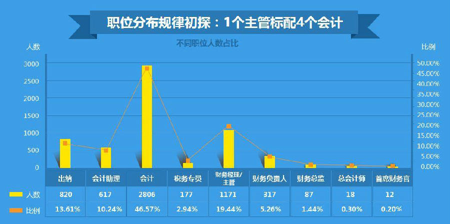 我们可以看到,财务工作中的主力军便是普通的会计人员,会计、税务专员、会计助理、出纳加起来共占了73.36%。