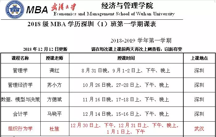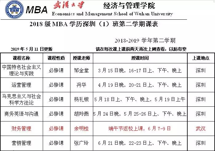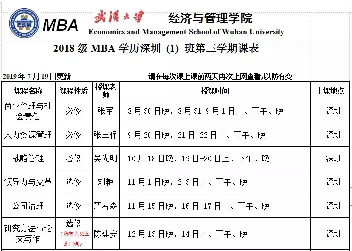 深圳的学习方式是集中学习方式,一个月集中一次或两次进行授课。按2018级的培养方案,深圳学生每年要到武汉上课1-2次。以2018级的课表为例,具体如下: