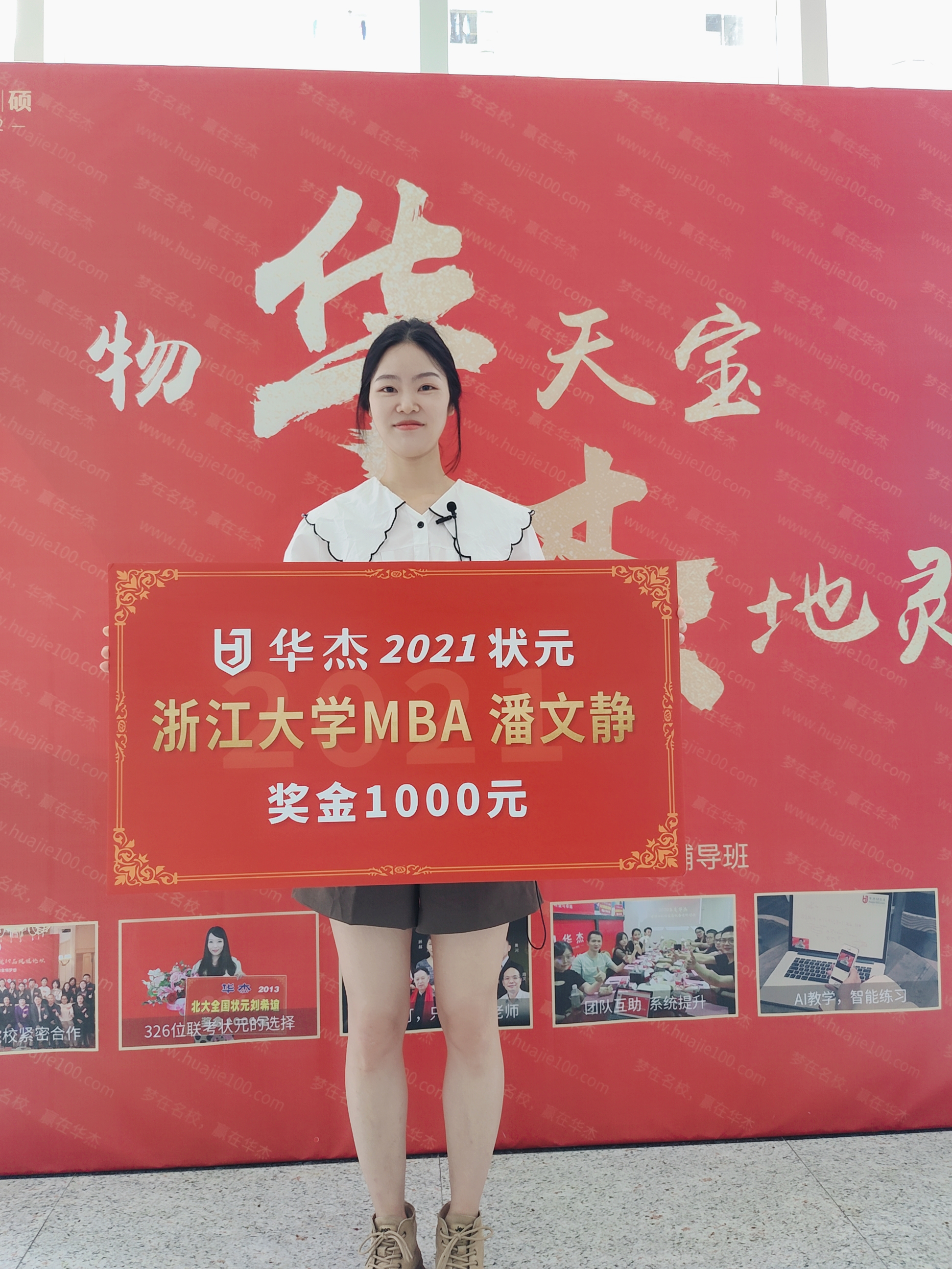 2021浙江大学MBA“状元”——潘文静 华杰的小伙伴们大家好,我叫潘文静,是2021年浙江大学MBA考试的笔试状元,我的总分是235分,英语是84分,综合是151分。 我报的是华杰的面试班和笔试班,华杰教育对学习非常有帮助,陈剑老师和赵鑫全老师都是我觉得比较好的老师,而且是MBA考试每一个科目只需要认准一个老师,然后紧跟他的学习节奏就可以了,并不需要报很多老师的班,因为每个老师都有每个老师的体系。