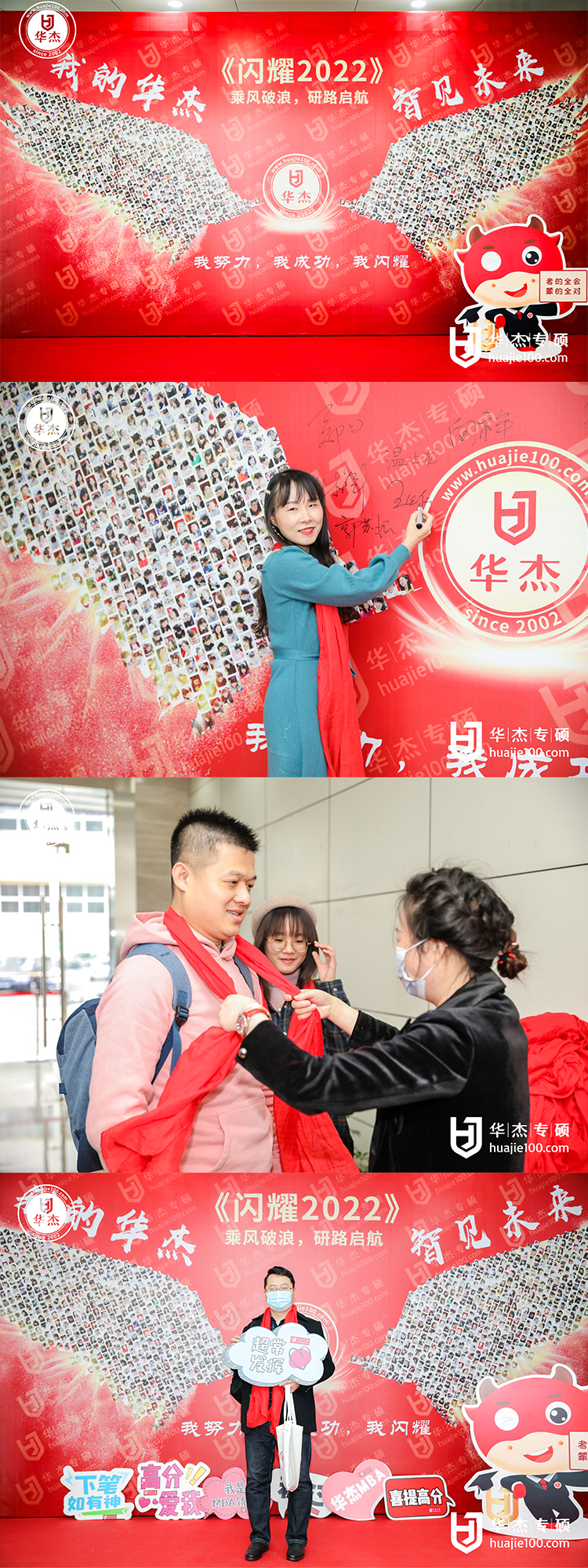 毕业典礼当天,华杰工作人员早早的就来到了现场,为大家准备了象征着“红红火火”的红围巾和“马到成功”的橙子。同学们领取祝福后,纷纷签名合影留念,要知道“考前留名”就会“榜上有名”哦!