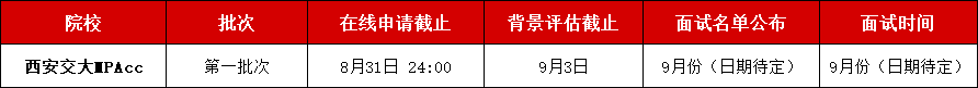 西安交通大学管理学院MPAcc中心将组织专家组对考生申请材料进行评审,择优给予符合条件申请人提前批面试资格,发布面试名单。面试资格主要根据申请人的教育背景、工作经历、荣誉奖励等进行综合评价。