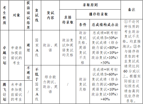 注:“腾飞计划”复试考生除参加政治和英语复试外,还须参加综合能力测试,复试成绩组成为政治占比10%、英语占比10%、综合能力测试占比80%。