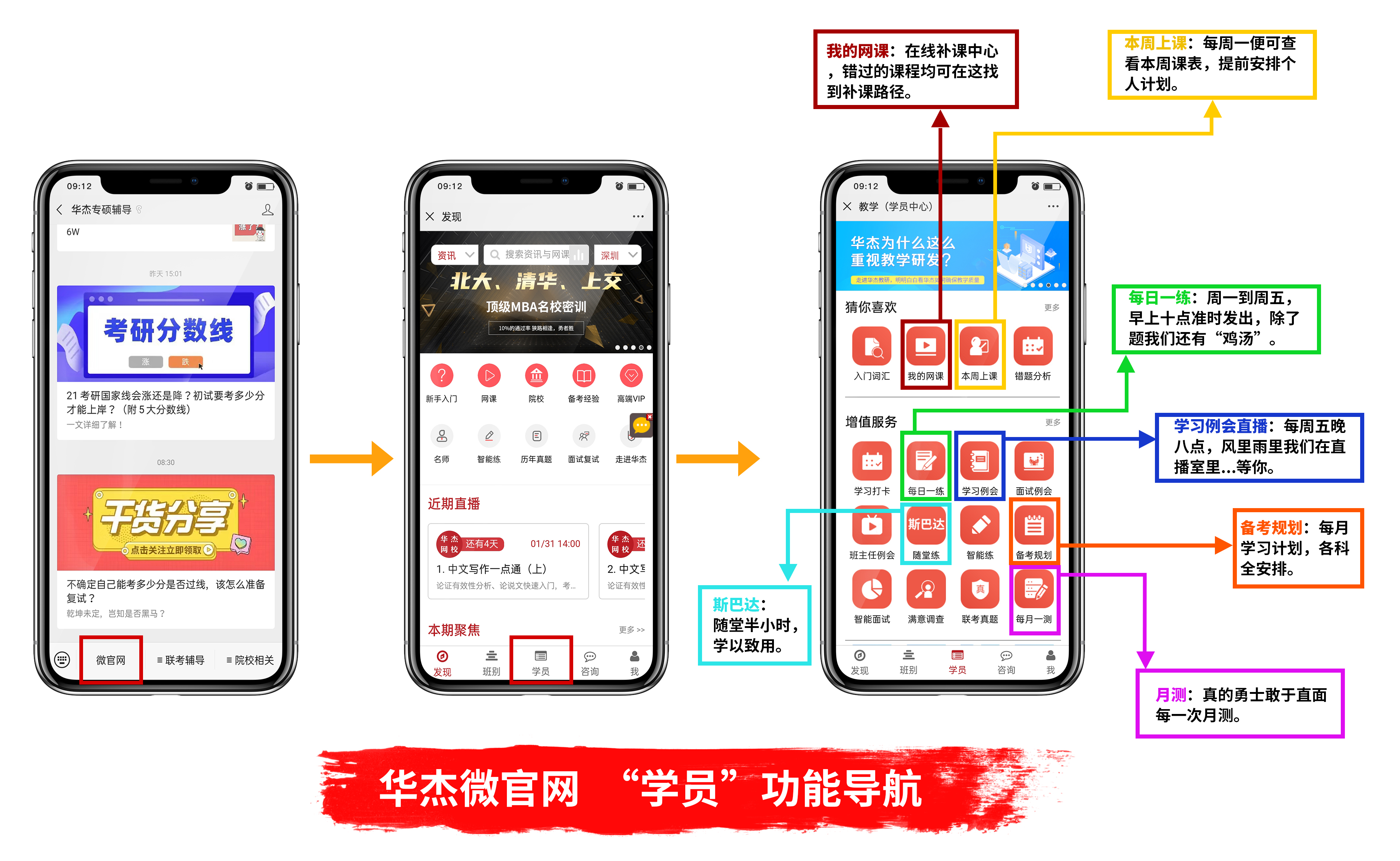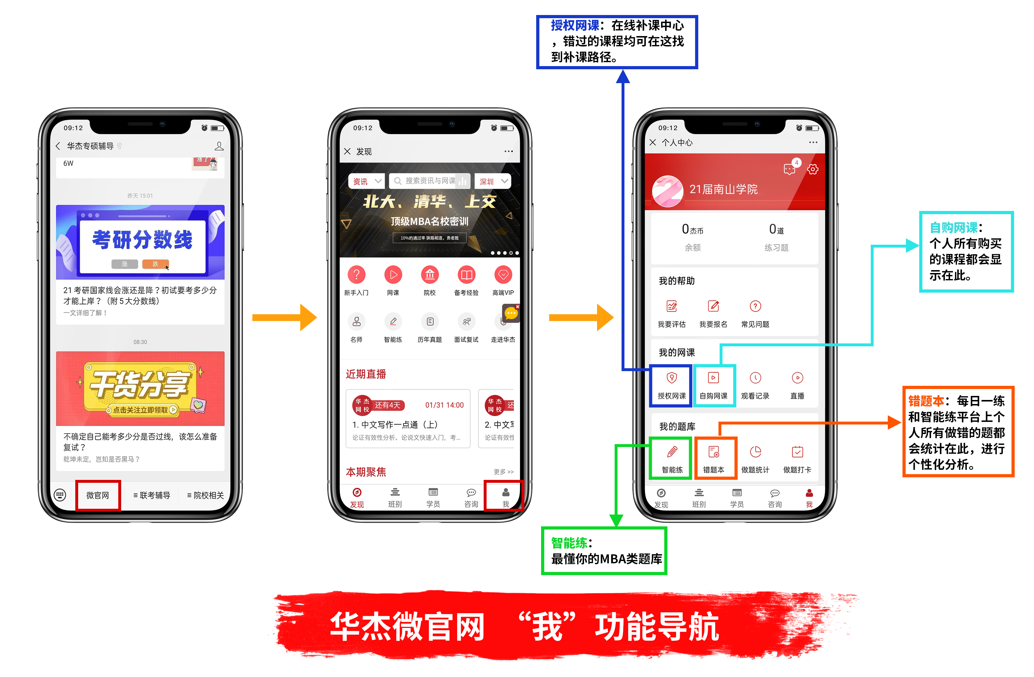 1、报考流程 报考备考注意梗概及相关流程 》》2、提前面试 MBA提面一页通 》》3、院校梗概 招生院校速览表 》》4、为使您刚报名的您尽快赶上进度,我们为您准备了系列预备网课,请在正式上课前预习。如果您才开始备考或基础比较薄弱,这个模块很适合您。您注册成正式会员后,华杰后台会自动开通您报名的相应班别的课程。(1) 数学6小时黄金入门速成 》》八、交流群与通知群1、为方便各位学友进行互动交流、各科答疑等,华杰特建微信通知群与交流群,只有已报名学员才可以加入,并且需要实名。2、通知群--报名后我们会将您拉进相应的校区微信通知群;本群只用于发送各类通知与最新资料,不进行任何交流;为让其他学员第一时间知道最新资讯,防止刷屏引起的遗憾,请勿在此跟帖交流。如您有任何疑问,可私信您的报名老师与华杰答疑老师交流。3、交流群--我们会同时会将您加入相应的学习小组群,这个群里有组长、各个学科代表、答疑老师,您可以在此自有交流,但仅限于学习交流。九、在线网课课表1、同步网课班: 点击此处查看 》》2、特色网课班: 点击此处查看 》》