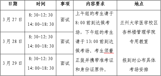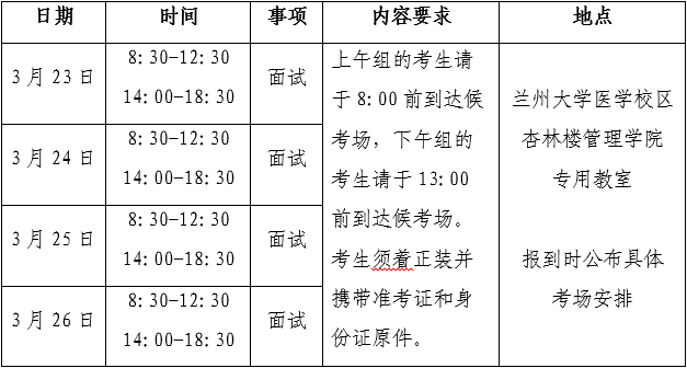 (1)面试前三天在“兰州大学管理学院专业学位招生复试系统”(网址:http://mbampa.lzu.edu.cn/apply/index/login)公布考生面试日期。